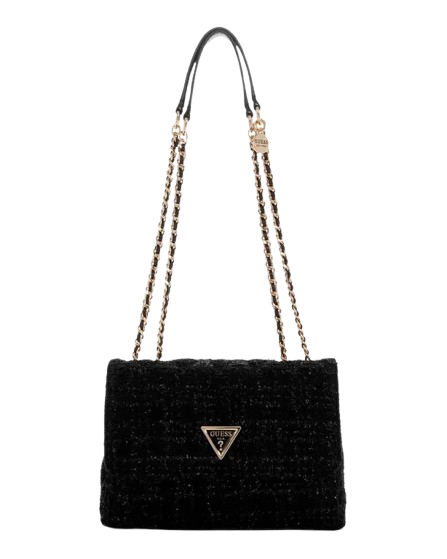 Cartera tipo shoulder bag en terciopelo negro con detalles brillantes. Cadena dorada ajustable y broche triangular metálico. Perfecta para eventos nocturnos y ocasiones especiales. Dimensiones: 25 x 18 x 8 cm.